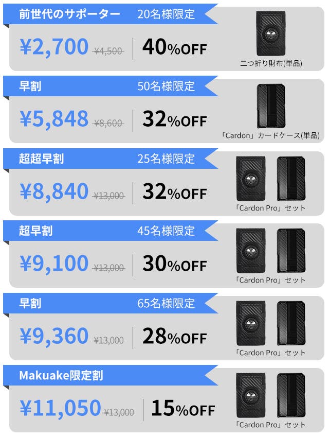 ※「Cardon」をご応援購入いただいた皆様への感謝を込め、特別リターンを用意しました。新開発の二つ折り財布を2,700円(送料込)でご提供。数量限定20個のため、お早めにお申し込みください。今後ともよろしくお願いいたします。