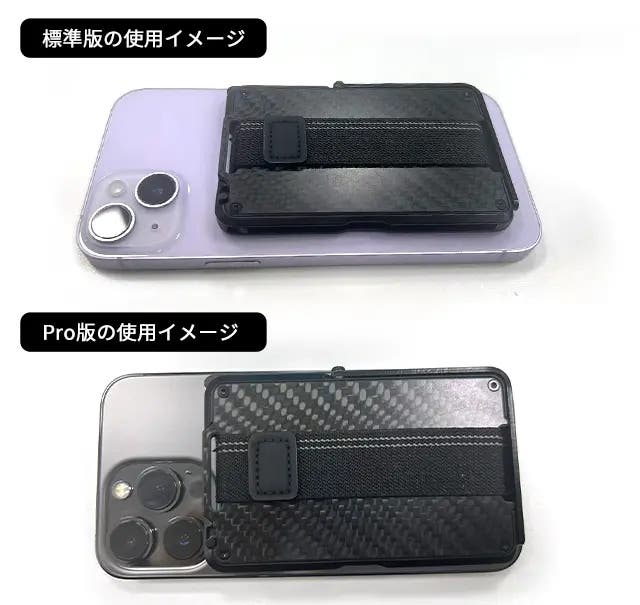 A:MagSafe対応機種および対応ケースに吸着可能です。具体的には、iPhone 12シリーズ以降の機種(※iPhone 12 miniとiPhone 13 miniは除く)でご利用いただけます。標準モデルとProモデルの装着イメージは以下の通りです。Proモデルはカメラモジュールが大きいため、装着時にレンズ下部の正方形フレームに一部接触します。レンズ自体は完全に避けた設計のため、撮影機能に影響はありません。