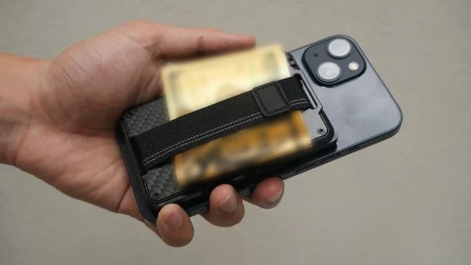 カードケースはスマホに直接吸着可能なため、スマホと一体化してポケットに収納できます。二つ折り財布部分も厚さ2.7cmの薄型設計でかさばりません。