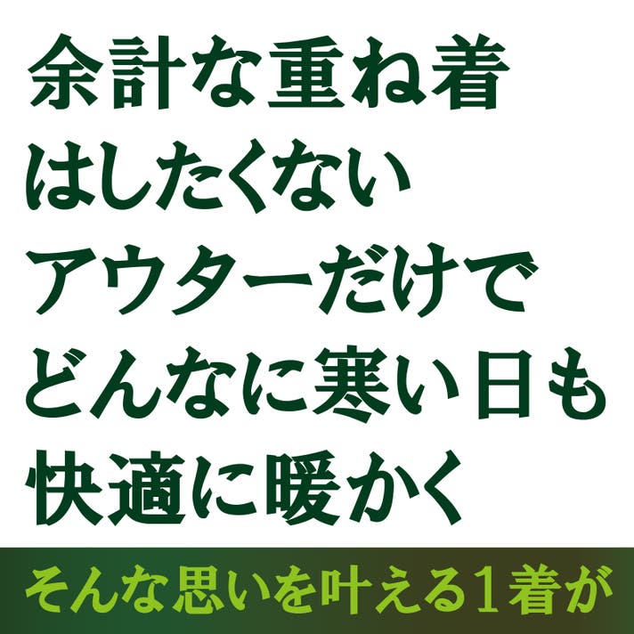 - 開発担当者が昨年の真冬(氷点下もあった)を上着これ1着のみで過ごすことができた奇跡のアウター