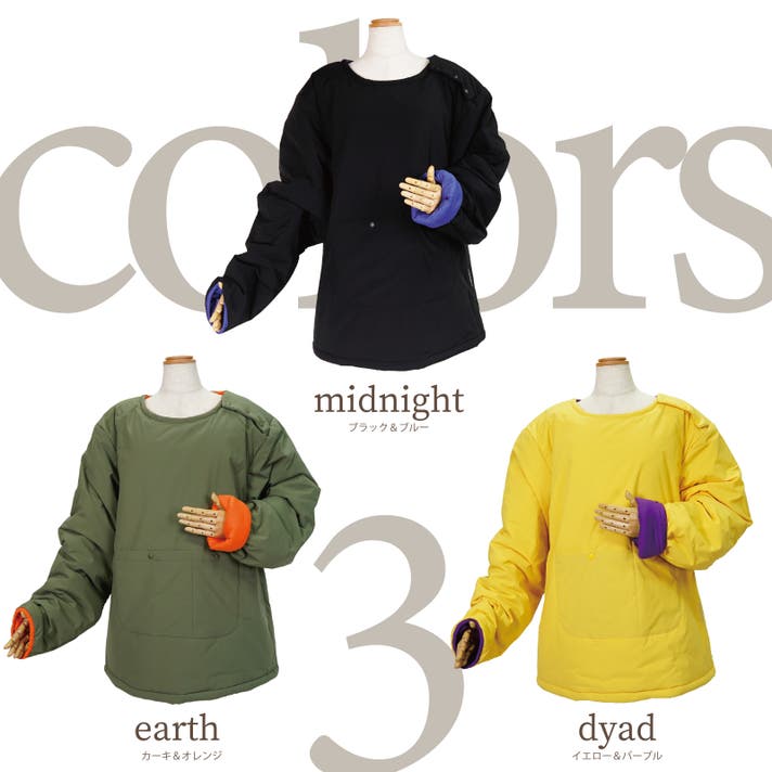 機能:熱収集蓄熱素材綿、スマホが入る大きさの前ポケット、ペットボトルも入る大きな内ポケット、山中で目立つビビットな裏地カラー、抗菌・消臭、耐久性と撥水に優れた表生地