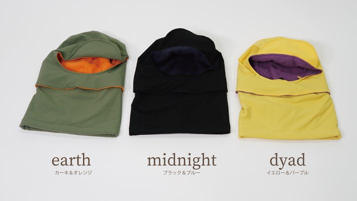 カラー:【山中で目立つビビットな裏地カラー】アース(カーキ×オレンジ)、ミッドナイト(ブラック×ブルー)、ダイアード(イエロー×パープル)、