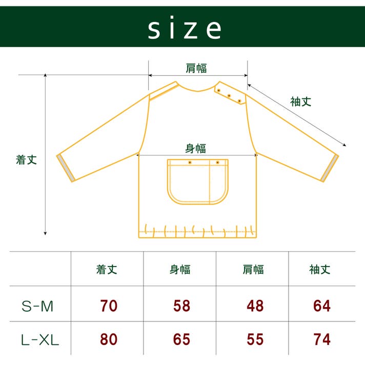 サイズ S-M:身長150cm~170cmに最適。着丈70cm身幅58cm肩幅48cm袖丈64cm、 L-XL:身長170cm~190cmに最適。着丈80cm身幅65cm肩幅55cm袖丈74cm