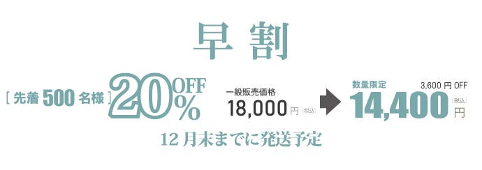 ・一般販売予定価格(税込):¥18,000⇒¥14,400【3,600円引き!】