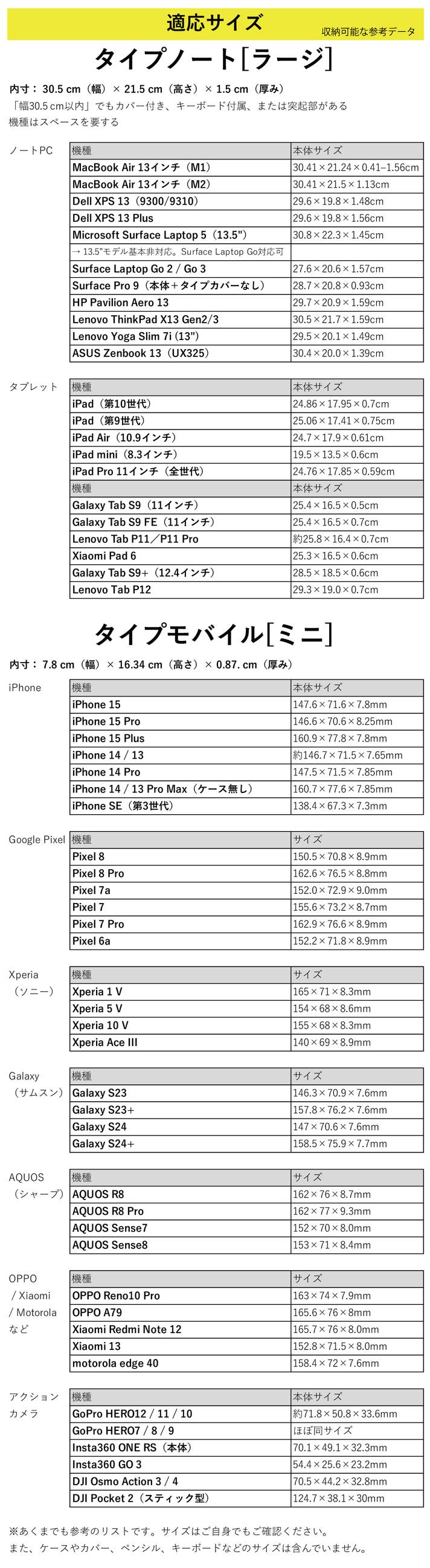 パソコンやスマートフォンを収納する場合の、可能なデバイスサイズの目安。