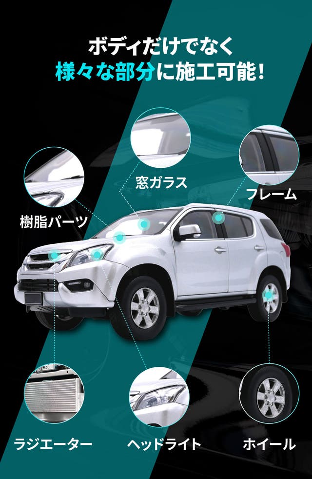 ナノコート『DETAILER』は車のボディだけでなく窓ガラスやヘッドライト、ホイール、樹脂パーツ部分など場所を選ばず施工できます。