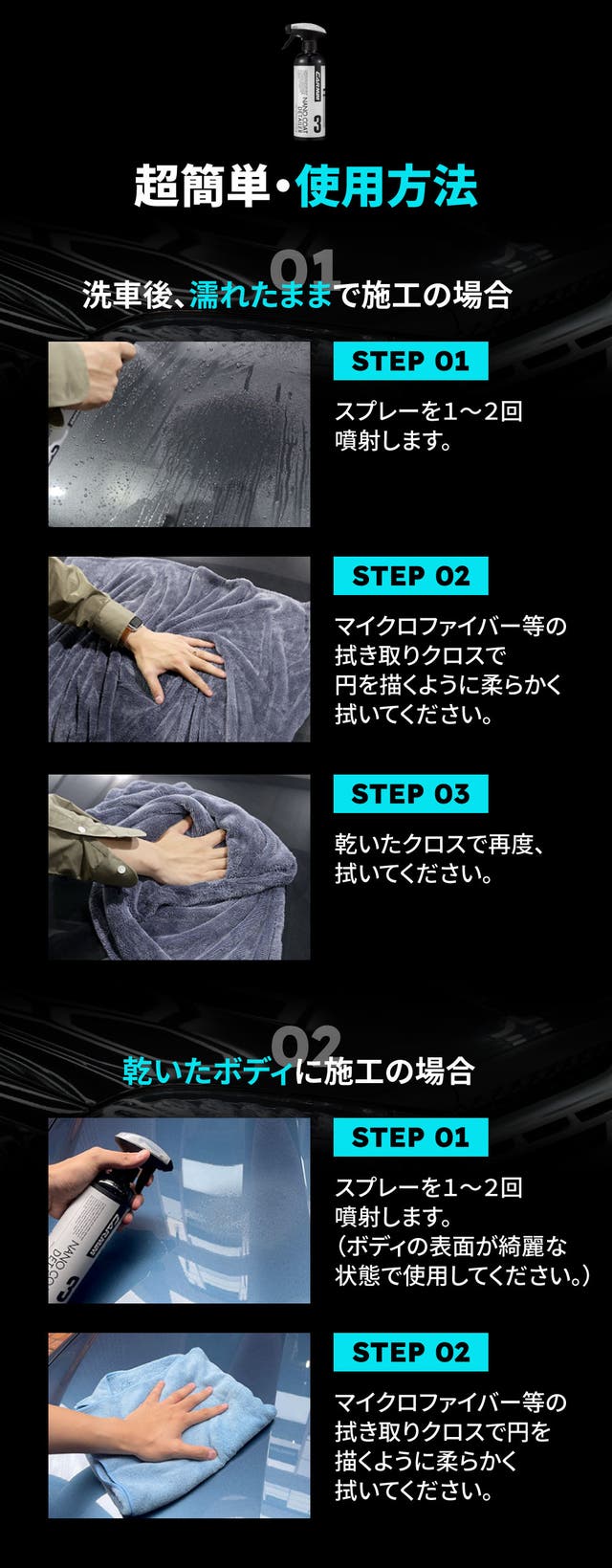 洗車後に水気が残ったままの状態で、シュッと吹きかけて施工していただければ問題ありません。