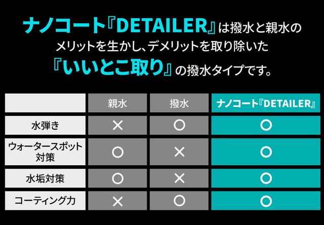ナノコート『DETAILER』は高度なナノテクノロジーで、コーティング後はスルスルッと滑らかな質感を実感できます。