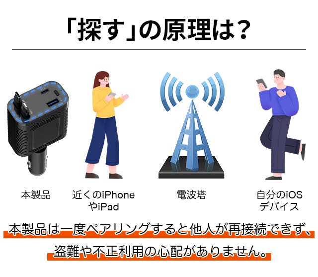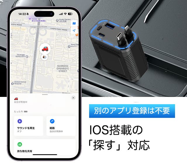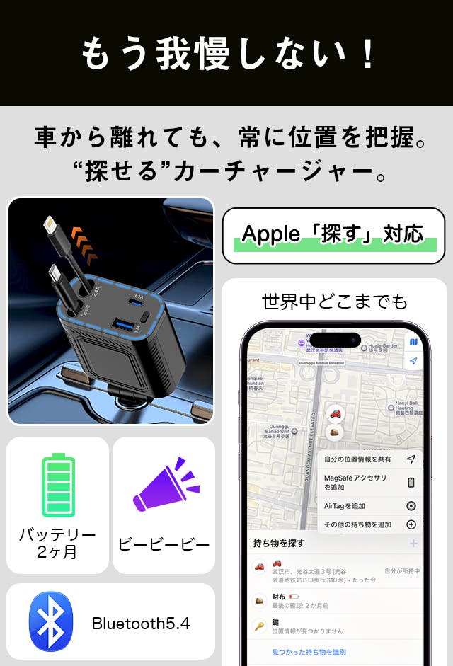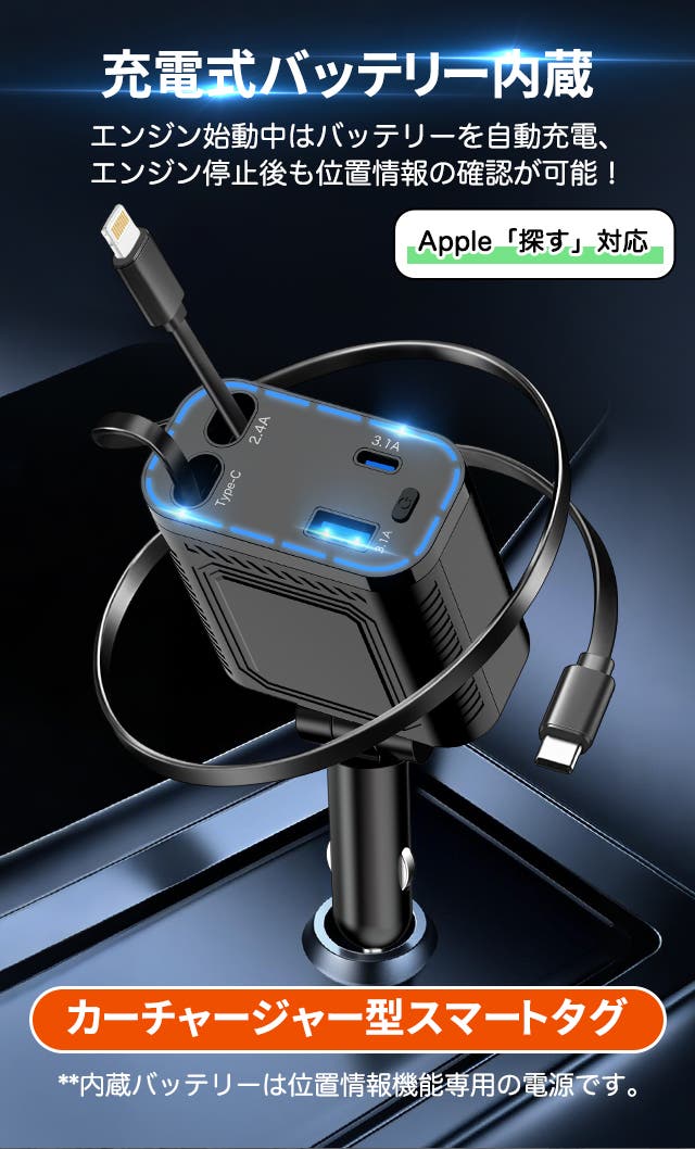 - Apple探す機能を搭載し、車の位置や充電器の所在をスマホから簡単に確認・追跡可能。