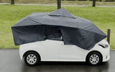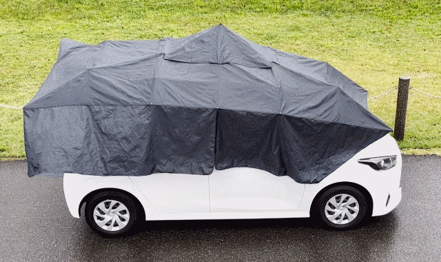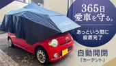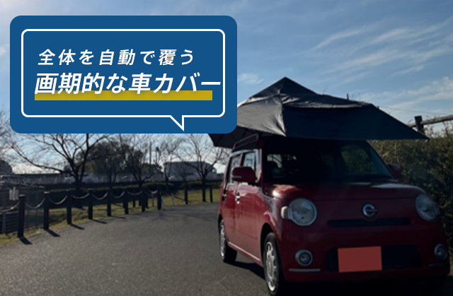 【カーテント】は車の屋根にセットするだけで、長さ4m、幅2.2mのテントが車全体を自動で覆う画期的な車カバーです。