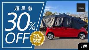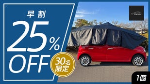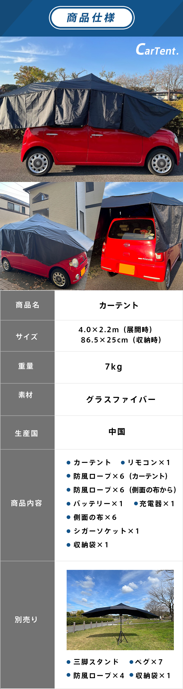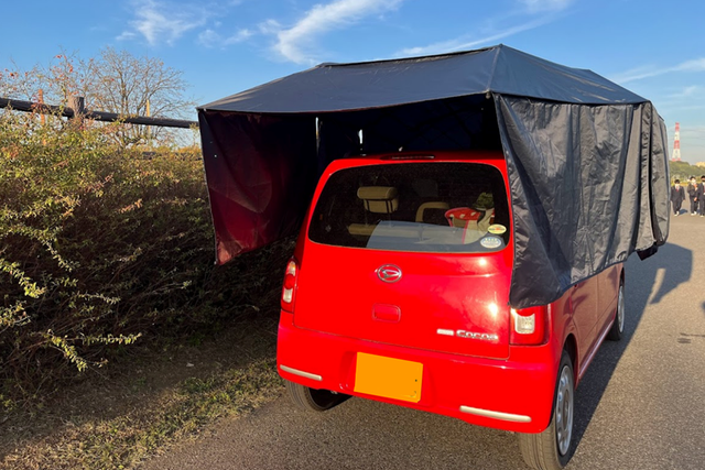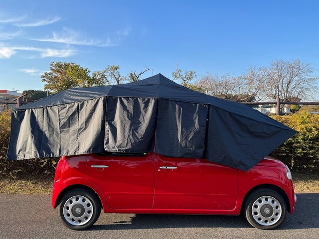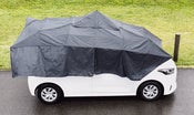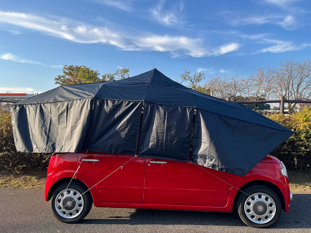 【カーテント】はリモコンでテントが自動開閉し、1分以内に設置や撤収が出来る優れもの。