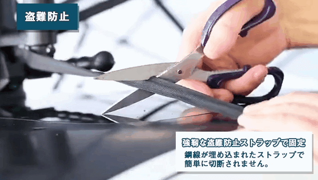 さらに盗難防止の鋼鉄ワイヤー内蔵ストラップも付属。