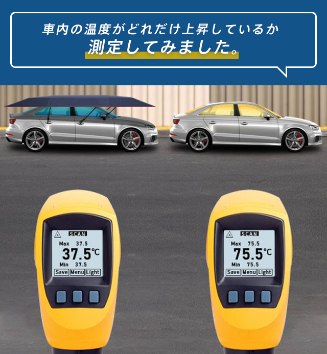 真夏の午前11時の段階で気温34度の炎天下に、同じ条件で【カーテント】の有無で車内の温度がどれだけ上昇しているかを測定してみました。