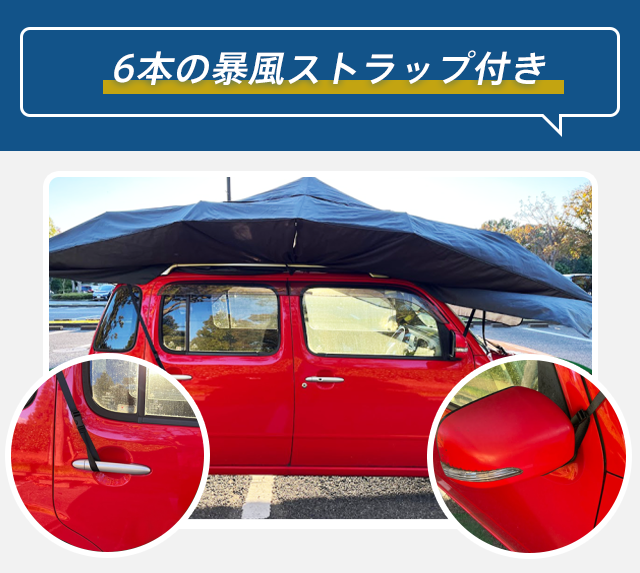 車のホイールやサイドミラー、ドアハンドルにテントを固定できるストラップも12本付いているので多少の風ではびくともしません。