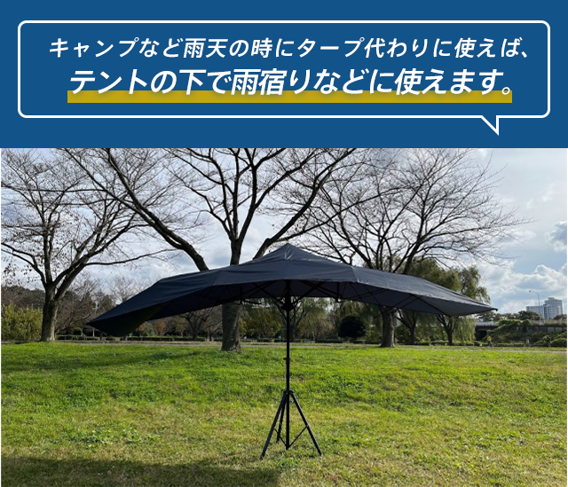 長さ4m、幅2.2mと長いので、キャンプなど雨天の時にタープ代わりに使えば、テントの下で食事や雨宿りなどに使えて大変便利。