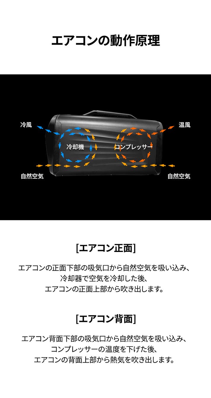 冷風扇のような気化式とは異なり、本製品は冷媒を使用し、コンプレッサーと冷却機構によって冷風を生み出します。