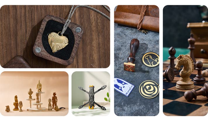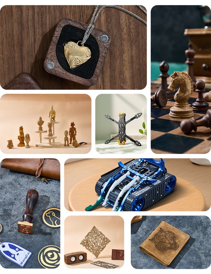 クールなレーザー彫刻・切断を自分でやってみたい人には、オプションの「レーザーモジュール」がおすすめです。対応素材は、木材、プラスチック、布、革、段ボールなど幅広く、アイデア次第で可能性は無限大。本体には、加工の仕上がりをより美しくする内部機構も搭載されています。