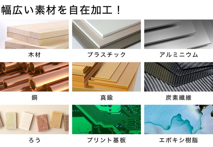 木材やプラスチックはもちろん、対応できる材料は、アルミニウム、真鍮、PCB、炭素繊維、ろう、エポキシ樹脂など多岐に渡ります。