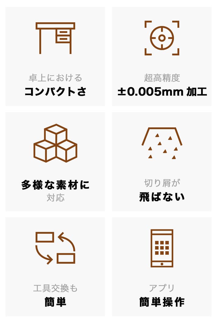 Carvera Airの特長は「コンパクト卓上型」「超緻密な加工精度±0.005mm」「工程が極めてスムーズ」など多岐に渡り、個人から小規模企業まで、幅広いものづくりをカバーします!