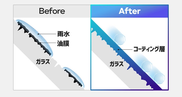 水を引き寄せる親水状態のガラスは、走行中、雨水により光の滲みが発生する可能性があるため、クリアな視界のため撥水コーティングの必要性が高まります。