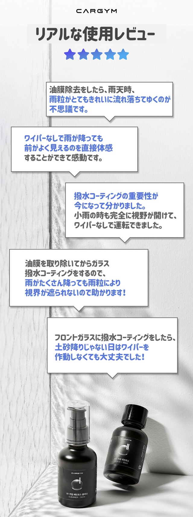 一度ガラスに撥水コーティングをしたことのある方は、その後もコーティングをせずにはいられなくなるそうです。 ガラス撥水コーティングを一度も経験したことがないか、高い費用が負担でためらっていらっしゃる方は、この機会にぜひ、CARGYM撥水コーティング剤をお試しください。いつものドライブがもっと楽しくなること間違いなしです!