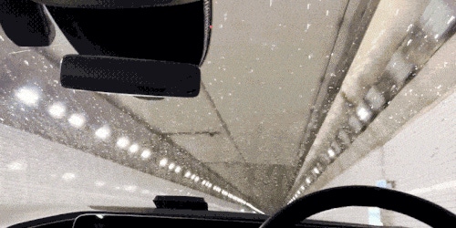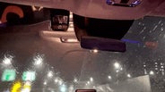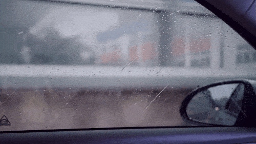 (撥水コーティング後の助手席の窓ガラス)時速45km走行の時点から雨粒が動き始め、ワイパーなしでも視野を確保することができます。大雨に強く、夜はより鮮明なレインフォースのパフォーマンスをご体験ください。