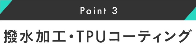 TPUとは、ゴムのような弾力性のある素材で、防水性に優れ汚れにも強く、 これを生地にコーティングする事で防水性を高めることができます。