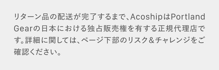 ▼ 必ず内容をご確認ください▼ ・リターン品の配送が完了するまで、AcoshipはPortland Gearの日本における独占販売権を有する正規代理店です。 ・並行輸入品が発生する可能性がございます。正規以外での個人輸入等は、完全に防ぐことができない場合がございます旨、予めご了承のほどお願いいたします。 並行輸入品は正規代理店による製品保証を受けることができません。また、正規代理店を通じて購入することで、日本国内での流通に必要な各種認証の取得や、関税の適切な処理が担保されます。 ・初期不良対応:商品到着から1ヶ月以内に不具合があった場合に限り、弊社(Acoship)が送料を負担し、返品・交換を承ります。 ・初期不良以外に関する返品・返金・交換はお受けいたしかねます。 使用感などに関しては、感じ方に個人差がございます。そのため、使用感等に関する返品・返金はお受けいたしかねます。 その他、サイズが合わない、誤注文、長期不在などのお客様都合によるキャンセル・返品・返金・交換はお受けいたしかねます。 また、お客様の責任により破損、汚損が生じた商品や商品のタグ、付属品、パッケージ(箱、袋など)を紛失、破棄された商品も返品・返金・交換をお受けいたしかねます。 ・モニター環境によって、画像の色が実物と異なって見える場合がございます。 ・本文中に記載させていただいたスケジュールは、あくまでプロジェクト公開時点の予定です。応援購入の性質上、配送遅延のおそれがございます。原則として、配送遅延に伴う応援購入のキャンセルはできませんが、リターン配送予定月から 3ヶ月を超えた場合には、希望者に限りキャンセルにて対応させていただきます。 ・想定を上回る程、多くのお客様からの応援購入を頂いた場合、製造リードタイムに時間を要し、お届け時期が遅れる可能性がございます。 ・海外輸送中のトラブルや通関時のトラブル等でお届け時期が遅れる場合がございます。 以上の注意点につきまして、あらかじめご理解とご了承をいただいた上で、応援購入下さいますよう、よろしくお願い申し上げます。 最後までご覧いただき、ありがとうございました。皆さまの日常を彩ることができるよう、心を込めて対応いたしますので、応援のほどよろしくお願いいたします!