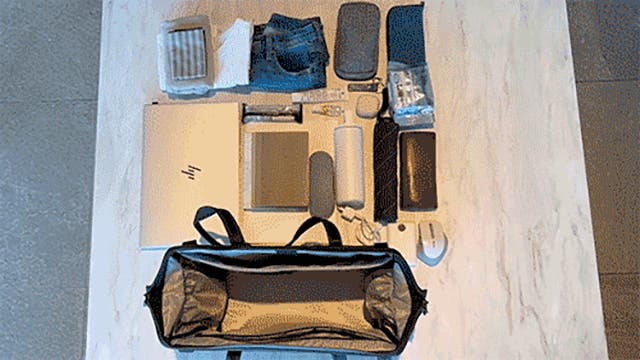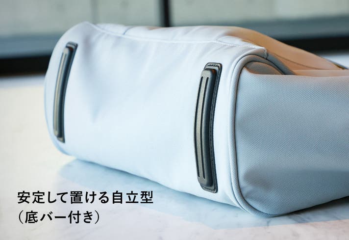 移動中でも自立型で床に置ける。荷物を持ったままや、膝の上で抱えたままの移動を避けられ、ハンズフリーに。