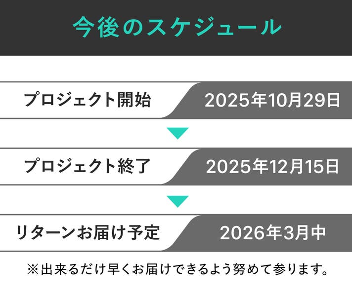 このプロジェクトはAll in型です。目標金額の達成に関わらず、プロジェクト終了日の2025年12月15日までに支払いを完了した時点で購入が成立します。