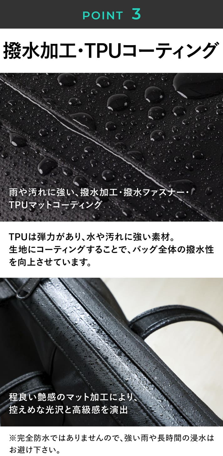 - 仕事も休日もこれひとつ。撥水加工で汚れにも強く、日常をタフにサポート。