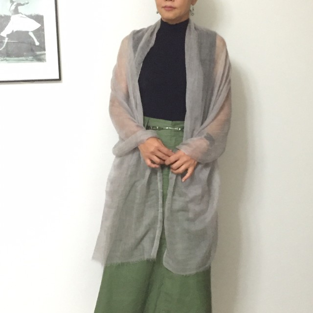 といった特徴を備え、美しいウェーブを描いています。また、薄く・軽いストールですが上質カシミヤの弾力性があり首に巻いてボリューム感を出すことも可能です。