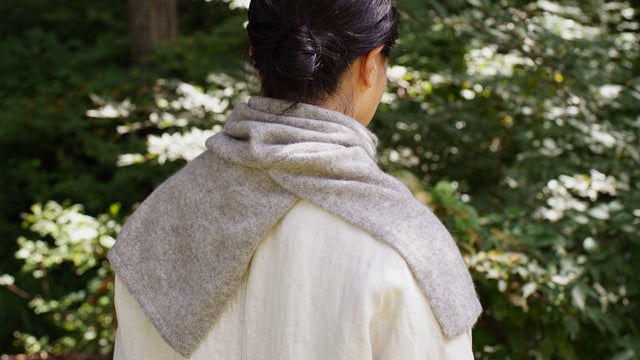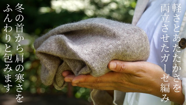 甘くふんわり編み上げるガーゼ編みで仕立てたネック&ショルダーウォーマーは、一般的な編地の同面積の製品と比較した場合、糸の使用量が抑えられているため、それだけ軽く、さらには糸代が抑えられるため、販売価格も抑えられ、さらに温かいという3つのメリットが生まれます。