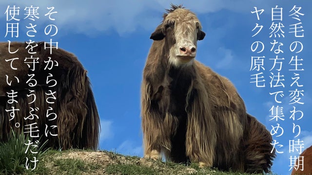 ヤクは寒冷地に生息するため、厳しく過酷な環境において発達した毛を持っています。 寒さから身を守れるよう、やわらかで上質な内側の毛と外側の硬い毛とで覆われ、保温性や防水性に優れています。ヤク製品に使用するのは内側の毛(うぶ毛)の繊維を使います、繊維の太さは、約14〜20ミクロン、長さは4~5cm。カシミヤと同程度かわずかに太いくらいです。
