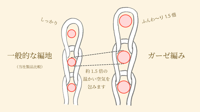 上図の通り、一般的な編地(天竺編み)よりも1.5倍ほど甘くふんわり編み上げることで、編地に適度な隙間(空気の層)が生まれ、二重窓のように温かさを保持する効果が生まれます。一般的な編地(天竺編み)とガーゼ編みの保温性の差を検査した検査機関によるデータでも、天竺編みよりガーゼ編みの保温性が5.3%高い結果となりました。