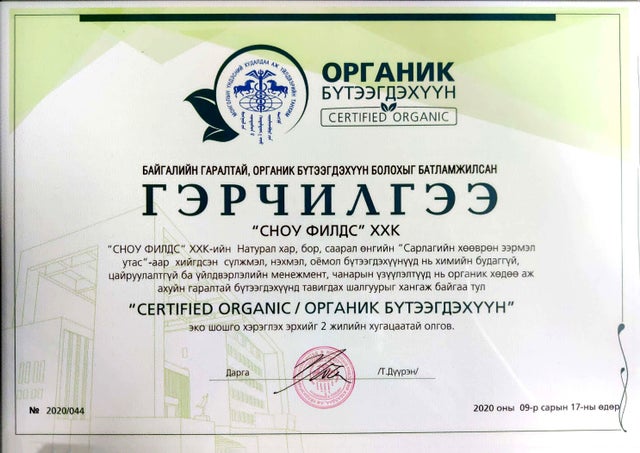 モンゴル商工会議所のオーガニック製品基準も満たし、2016年に認定書を取得(以下画像参照)。