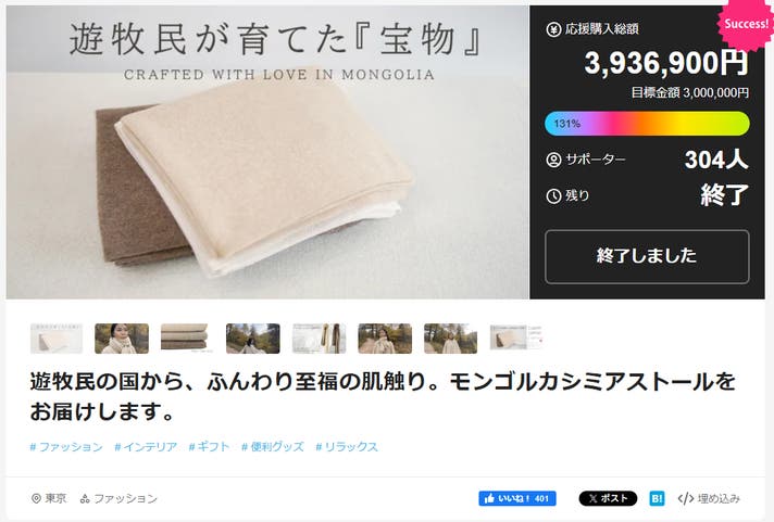 第1弾プロジェクトでは、多くのご支援・温かい応援をいただきました。『https://www.makuake.com/project/mongolia-cashmere/』