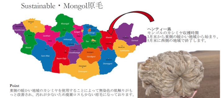 今回のプロジェクトでは、モンゴル東部の厳選された地域で育った高品質なカシミヤを使用しています。モンゴル東部は比較的温暖な気候のため、繊維がやわらかく、肌触りの良いカシミヤ原毛が育ちます。