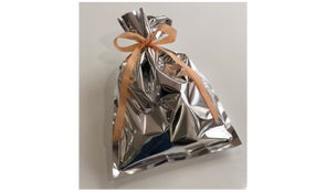 銀色の袋に入れ、オレンジのチェックリボンで簡単ですがラッピングが可能です。