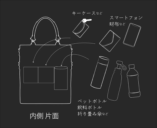 - 表はシンプル裏はスタイリッシュ。持つだけでおしゃれ度がアップするスマートなトートバッグ。