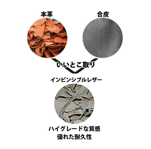 インビンシブルレザーとは、天然皮革製品をつくるときに出る革の端材を、最先端技術で高品質なレザーへと再生させたもの。質感が良く、それでいて軽く重、耐久性にも優れたサスティナブルな素材です。