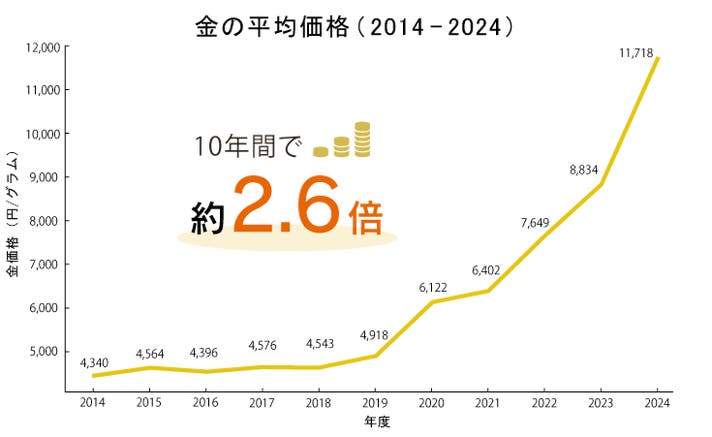 近年、世界的な需要の高まりにより、金の価格は上昇を続けています。過去10年でその価値は約2.6倍にもなり、資産価値の高い素材として改めて注目を集めています。