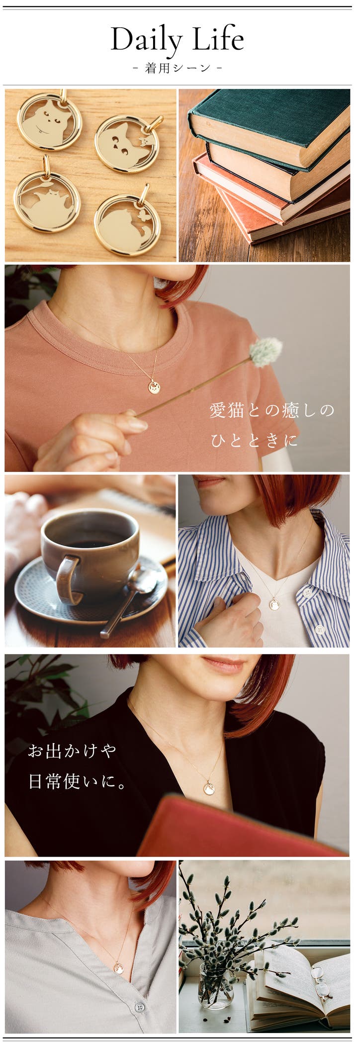 ひとつひとつのデザインには、遊び心とともに、ほっと心が和む日常の空気感が息づいています。身に着けるたび、猫との愛おしい時間をそっと思い出させてくれます。