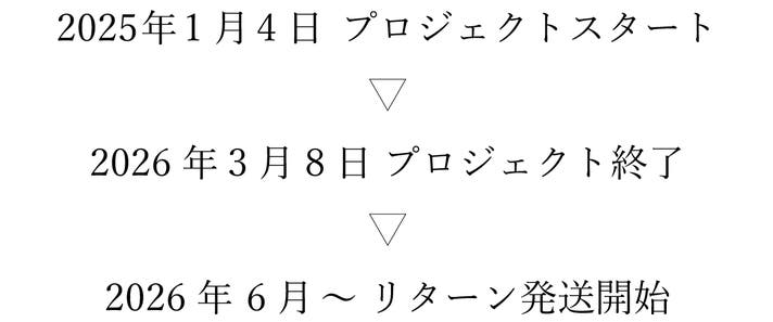 【商品等の不具合による交換】 原則として、サポーター都合によるキャンセル・返金は承っておりません。 (サポーター都合のキャンセル不可の例:誤注文、長期不在) 対応条件: 商品の初期不良、またはお届けした商品がご注文内容と異なる場合、到着後7日以内にプロジェクトページの「実行者にメッセージ」よりご連絡ください。状況を確認の上、良品との交換対応をさせていただきます。 送料/再送料: 実行者負担 【交換をお受けできない商品】 ・サポーターの責任により破損、汚損が生じた商品 ・商品のパッケージ(箱、袋など)を紛失、破棄された商品 ・事前にご連絡をいただいていない商品 ・商品到着後、8日以上経過した商品 ※本文中に記載させていただいたスケジュールは、あくまでプロジェクト公開時点の予定です。応援購入の性質上、配送遅延の恐れがございます。原則として、配送遅延に伴う応援購入のキャンセルはできませんが、リターン配送予定月から3ヶ月を超えた場合には、希望者に限りキャンセルにて対応させていただきます。 ※初期不良以外の使用感・サイズ感等に関する交換はお受けいたしかねます。 ※商品紛失、盗難などによる返品、交換、補填は対応しておりませんのでご了承ください。 ※事情によりやむを得ずお届けが遅れる場合があります。予めご了承ください。 ※デザイン・仕様は予告なく一部変更になる可能性がございます。 ※想定を上回る皆様から応援購入をいただき、量産体制をさらに充実させることができた場合、一般販売価格が予定価格を下回る可能性がございます。 ※本文中に記載させていただいたスケジュールは、あくまでプロジェクト公開時点の予定です。