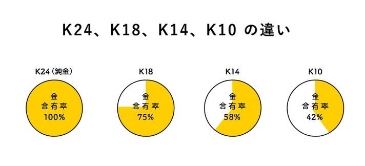 金は含有率の違いによって、K24(純金)、K18(18金)、K14(14金)、K10(10金)などに分けられます。金の含有量は18金は75%、 14金は58%、10金は42%となり、 金の含有率が高いほど、価値は高くなります。18金は、金を75%含む素材のため、変色しにくく、美しい輝きを長く保ちやすい特長があります。長時間身につけても風合いを損ないにくく、お手入れの負担が少ない素材としても知られています。