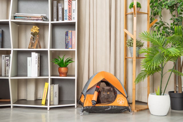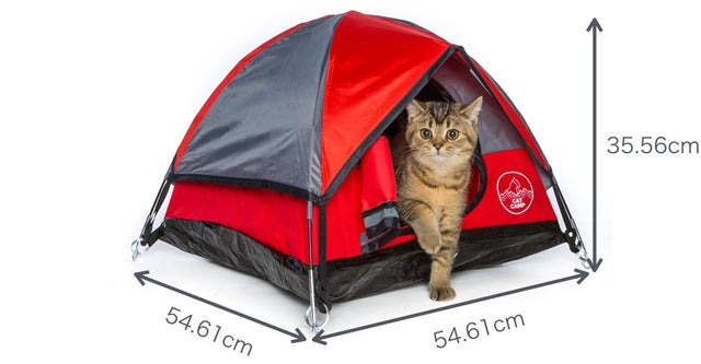 キャットキャンプは、通常のテントサイズを縮尺し、ネコの居心地のよさを追求・重視して設計されたネコ専用テントにゃ。