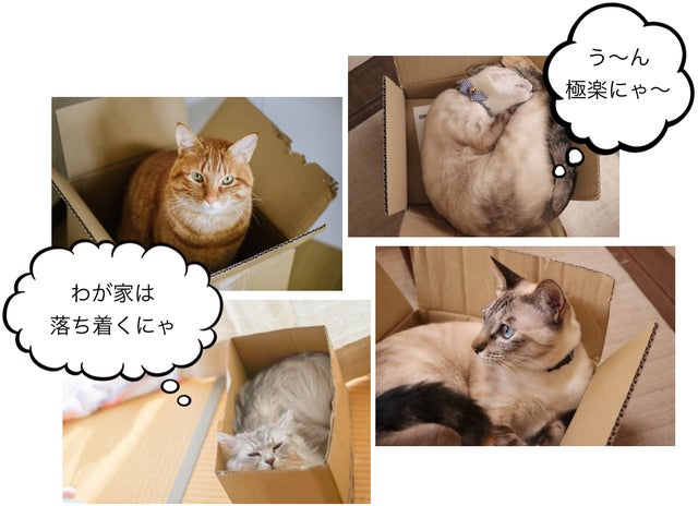ダンボールの空き箱を見つけると、どうしても入りたくなる! それがボクたちネコの習性にゃ。