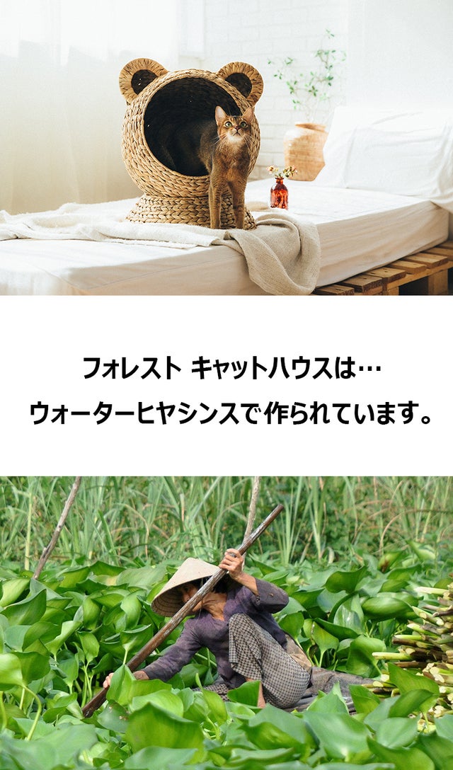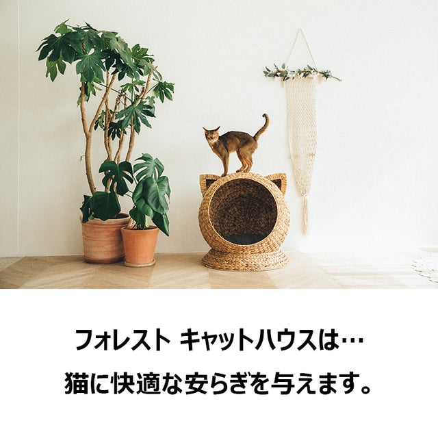 ウォーターヒヤシンスから漂う自然の香りは、猫たちの緊張をほどき快適な休息をサポートします。多くの猫たちはウォーターヒヤシンスの香りにより、ハウスの探索を2~3日間ほどで終えすぐに中に入ってくつろぎます。ウォーターヒヤシンスは柔らかいながらも丈夫で、猫たちが好む素材です。キャットハウスの上や中でウォーターヒヤシンスを引っ掻いたり触ったりし、ストレスを解消します。