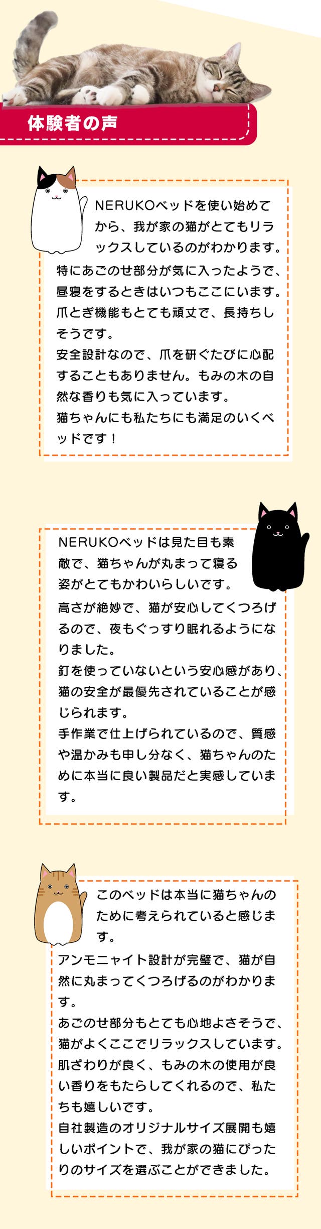 3.私たちは、長い歴史と職人技を持つ会社として、これまでの経験を活かしながら新しい挑戦に取り組んできました。 『NERUKOベッド』は、その成果の一つです。 釘を一切使わず、安心安全に配慮した設計で、猫ちゃんの健康と快適さを最優先とし、 肌ざわりや高さ、クッションによる心地よさ、爪とぎシートなど、全ての要素が猫ちゃんを想い造り上げたものです。 ぜひ、このベッドで猫ちゃんの幸福な時間をお楽しみください。