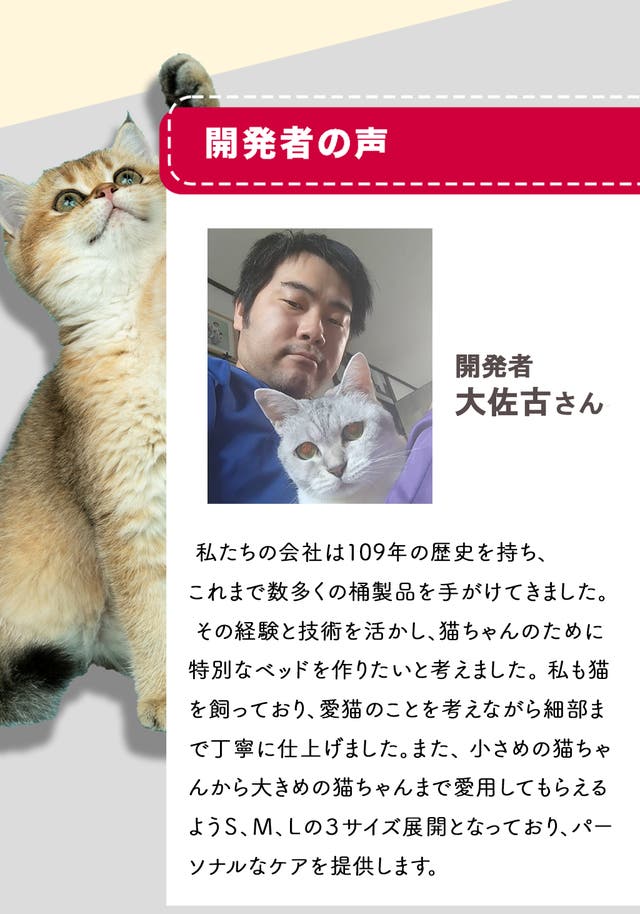 - 桶樽職人が愛猫を思い技術を活用し手がけて生まれた桶樽生まれの猫が入る専用の桶ベッドNERUKO
